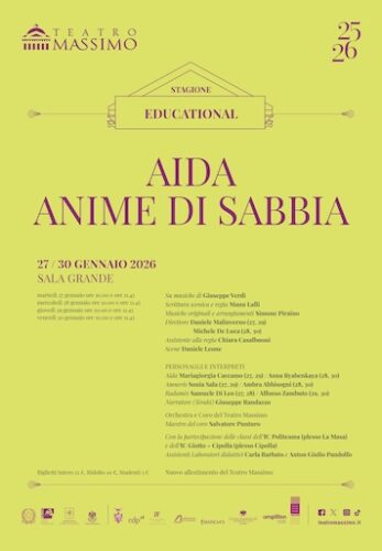 About 27 – 30 January 2026 | Main Stage Aida anime di sabbia with Giuseppe Verdi‘s music from 8 to 14 years old | School Group Bookings from November 11 2025 Director Manu Lalli Original music and arrangements Simone Piraino Conductor Daniele Malinverno (27, 29) / Michele De Luca (28, 30) Assistant Director Chiara Casalbuoni Scene Designs Daniele Leone Scene and Costume Making Marco Burberi, Paola Pietri and Ginevra Boni Teatro Massimo Orchestra and Chorus Chorus Master Salvatore Punturo A Teatro Massimo New Production Cast Aida Mariagiorgia Caccamo (27, 29) / Anna Ryabenkaya (28, 30) Amneris Sonia Sala (27, 29) / Ambra Abbisogni (28, 30) Radamès Samuele Di Leo (27, 28)/ Alfonso Zambuto (29, 30) Narrator (Teraki) Giuseppe Randazzo with the classes of the schools IC Politeama (plesso La Masa) and IC Giotto – Cipolla (plesso Cipolla) Educational Workshops Assistants Carla Barbato, Anton Giulio Pandolfo Tickets Full price: 12 € Students: 5 € Free entrance for 1 teacher every 10 students, students with disabilities and their support teachers Programme The plot Aida is not only a monumental opera set in an idealized Egypt, but a universal story that speaks of deep human emotions. The protagonists—Aida, Radamès, and Amneris—are young people overwhelmed by passions and ambitions greater than themselves, victims of an inexorable fate and a cruel and useless war. The opera thus becomes a reflection on love as the only way to give meaning to life. Gallery Ph. Franco Lannino Spoken parts of the performance are in Italian; a basic understanding of the language is adviced. This is an event for school groups. In case seats are available to the general audience, they will be on sale on the same day of performance at the box-office. Find out more about our Educational project for school groups. Poster